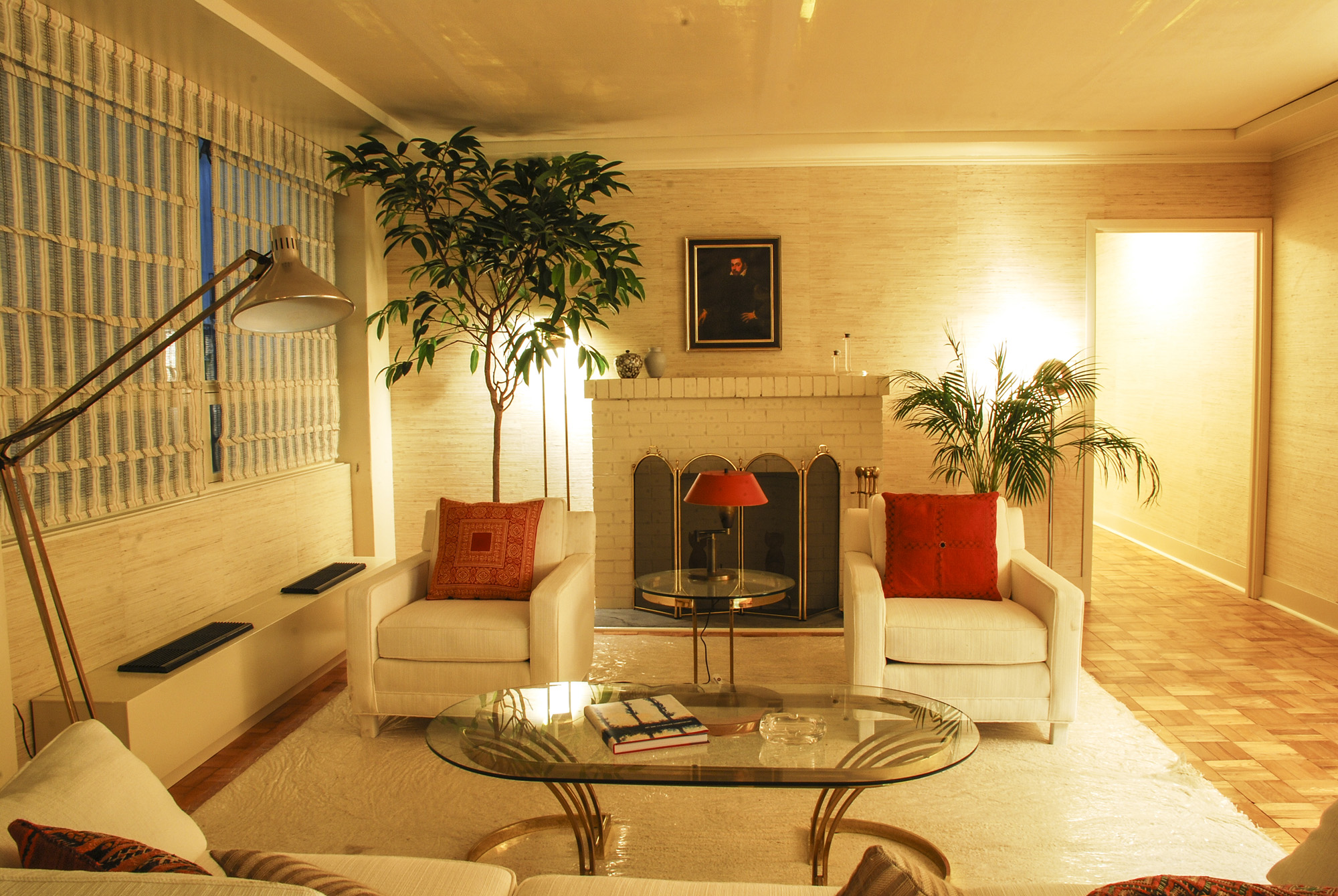 Set of Sydney’s (played by Amy Adams) apartment. Built on a stage and inspired by “White Brick” apartment buildings on Manhattan’s Upper East Side popular among single women in the 70’s and 80’s. This set was minimal and stylish with vintage parquet floor tiles with additional fabrication to match. As seen in Columbia Pictures’ AMERICAN HUSTLE. Production Design by Judy Becker