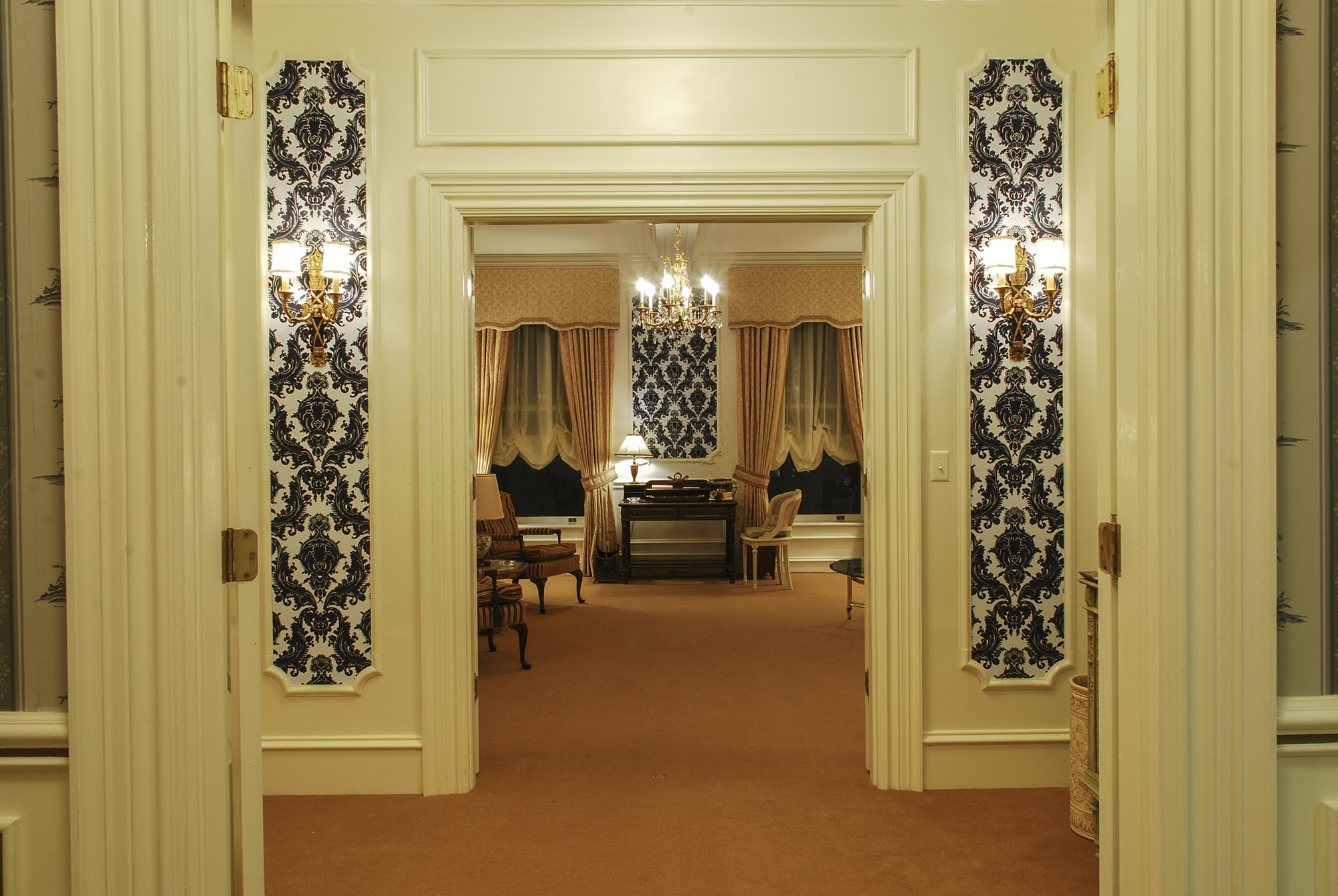 Set of the Plaza hotel built on a stage in two versions. Custom designed flocked wallpaper was the common element between the first “crummy” suite and the second “General Sherman” suite. As seen in Columbia Pictures’ AMERICAN HUSTLE. Production Design by Judy Becker