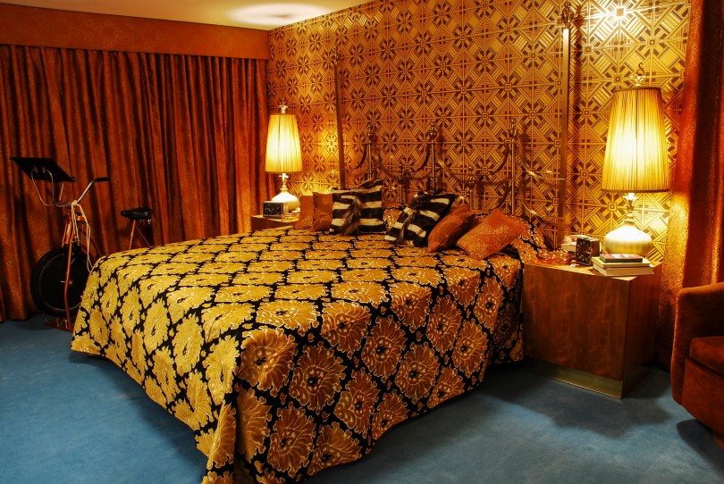 Set of Roz’s (played by Jennifer Lawrence) house. The vintage ranch house had to be completely redone, except for the stone fireplace. Every inch of the house was covered in vintage foil patterned wallpaper, carpeted, furnished and switched out with vintage appliances as seen in Columbia Pictures’ AMERICAN HUSTLE. Production Design by Judy Becker